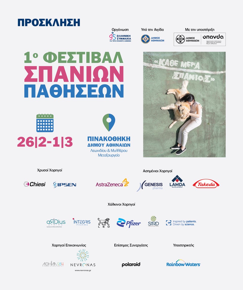 Το 1ο Φεστιβάλ Σπάνιων Παθήσεων «Κάθε Μέρα Σπάνιος» θα πραγματοποιηθεί από τις 26 Φεβρουαρίου έως την 1η Μαρτίου στην Πινακοθήκη του Δήμου Αθηναίων, αναδεικνύοντας την καθημερινότητα, τις προκλήσεις και τη δύναμη των σπάνιων ασθενών μέσα από τη γλώσσα της τέχνης και του πολιτισμού.